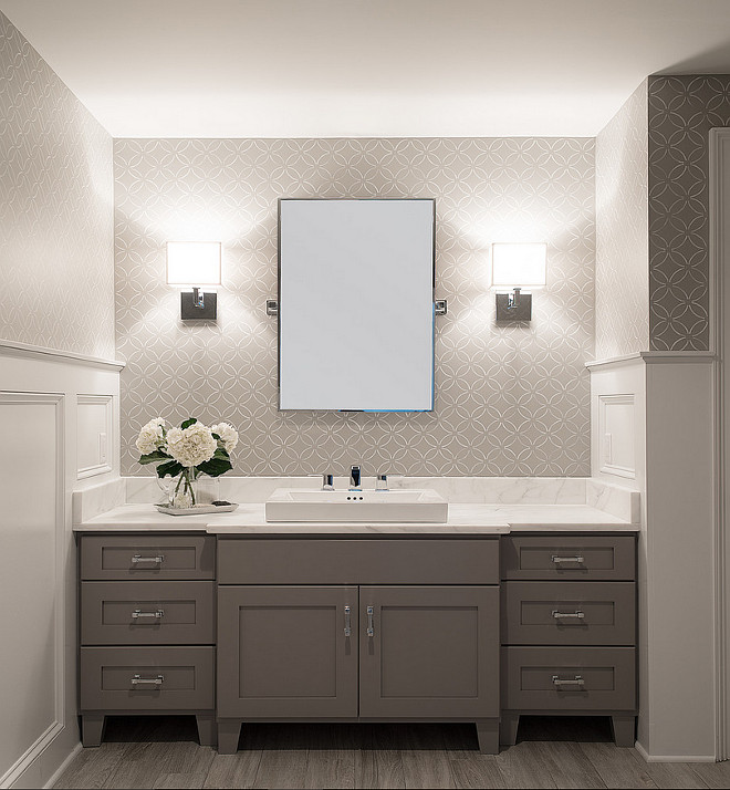 Cabinet paint color is Benjamin Moore San Antonio Gray at 75%.