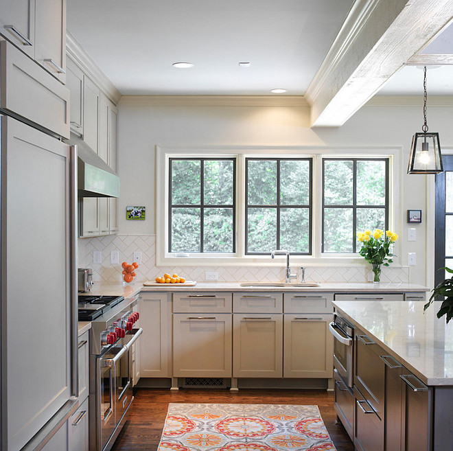 Kitchen cabinet paint color is “Revere Pewter Benjamin Moore HC-172”.