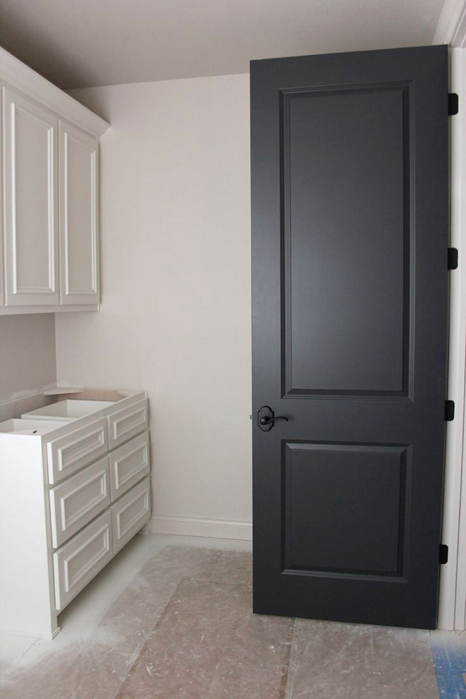 Door paint color: “Wrought Iron by Benjamin Moore”. Trim and cabinet paint color: “Westhighland White by Sherwin Williams”.