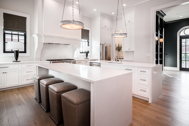 Kitchen Countertops: Aurea Stone, Epitome. Waterfall edge on islands.