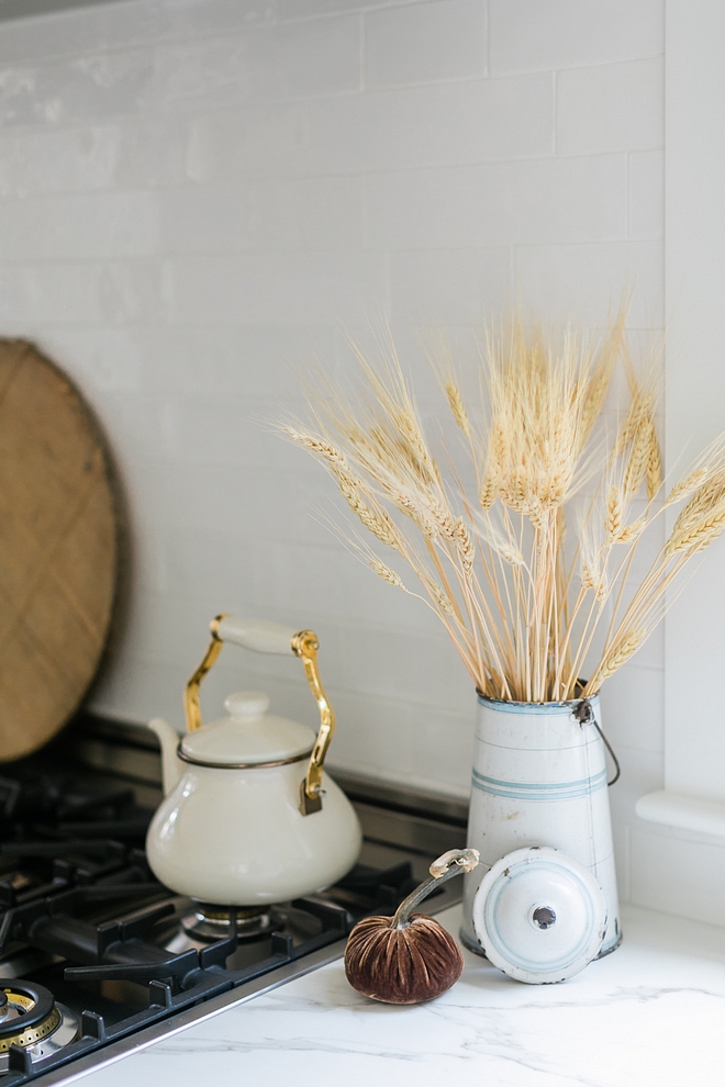 Any copper that I have stored away over the summer, makes its appearance in the kitchen when fall arrives. The warm copper shades mix well with neutrals and other metals.