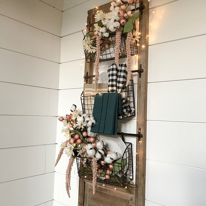 Last year for Christmas, I utilized dried hydrangeas everywhere in the cottage. I saved them to reuse and ended up making this unique fall garland! I took nine feet of rope and wired dried hydrangeas and pine cones, interwined with rag ties from white fabrics purchased at Goodwill and yard sales. All other accessories were sourced from thrift stores and yard sales. Pillow are Michaels after Christmas clearance last year.”