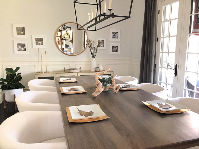 This fall, I brought the outdoors in by layering dried hydrangeas on top of various soft shades of green stems. The pumpkin filled lantern centrepiece is surrounded by various sizes and shapes of loose pumpkins and enough greens to fill in any gaps. This dining room table decor will remain until Thanksgiving, when it will become more formal replacing the lantern and pumpkins for candles and fresh flowers.