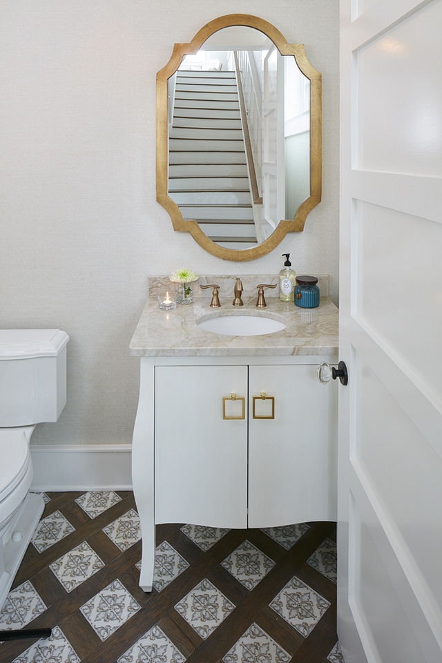 The powder room features a wood flooring in a criss-cross pattern with tile insets.