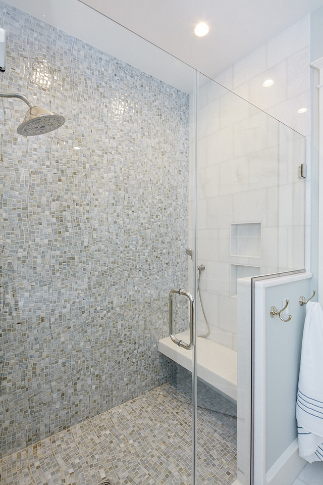 Floor Tile: Chelsea Blanco (similar here) – Shower Tile Wall: Profiles Ice White 3×6 (similar here) – Shower Accent Tile: Milstone White Naomi mosaic (similar here) – Shower Floor Tile: Color Palette Pale Matte 1×1 mosaic (similar here).