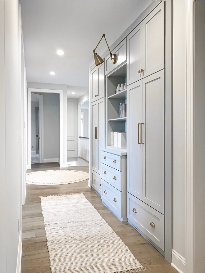 Who wouldn’t love to have a large closet in their laundry room, right? This one features White Oak shelves. Grey doors are in Coventry Gray by Benjamin Moore.