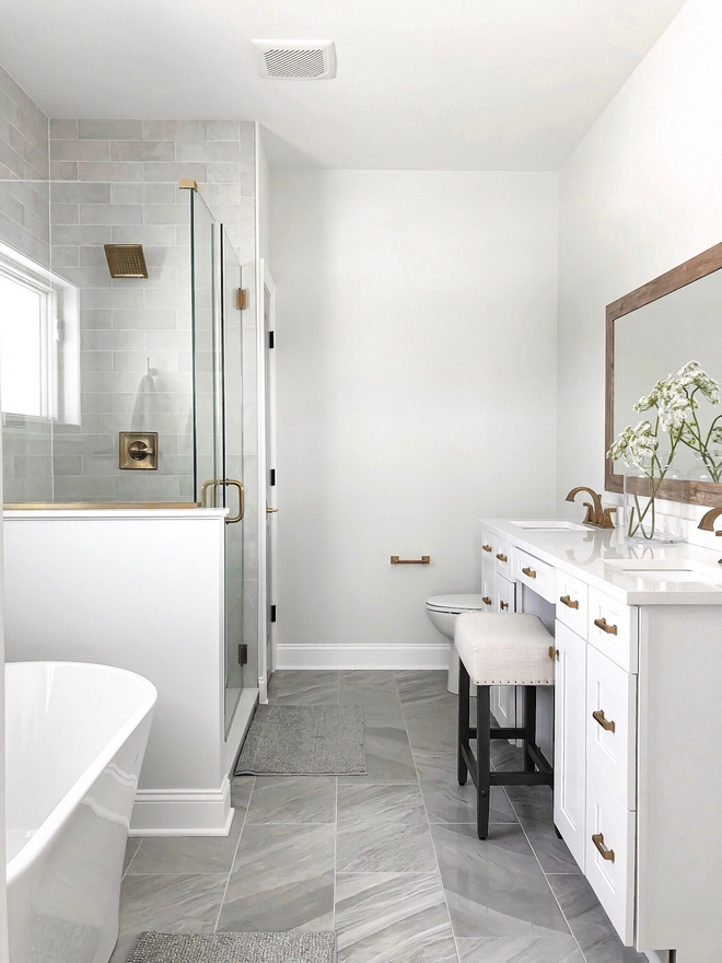 I am loving the elements chosen for the Master Bathroom. It feels elegant and timeless. Walls are in Reserved White by Sherwin Williams.