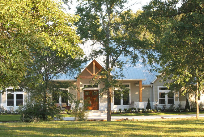 Nestled into the Piney Woods of east Texas and sitting on 13 acres, our home is a mixture of rustic chic, industrial, and modern farmhouse. The metal roof was left unpainted and we simply sealed all of the cedar that you see- I’ll never forget the incredible smell as the cedar was being cut and installed! Heavenly! The stone is a mixture of different stones, which we had white washed. The hardy plank is painted Sherwin Williams Requisite Gray and the white trim is Sherwin Williams Extra White.