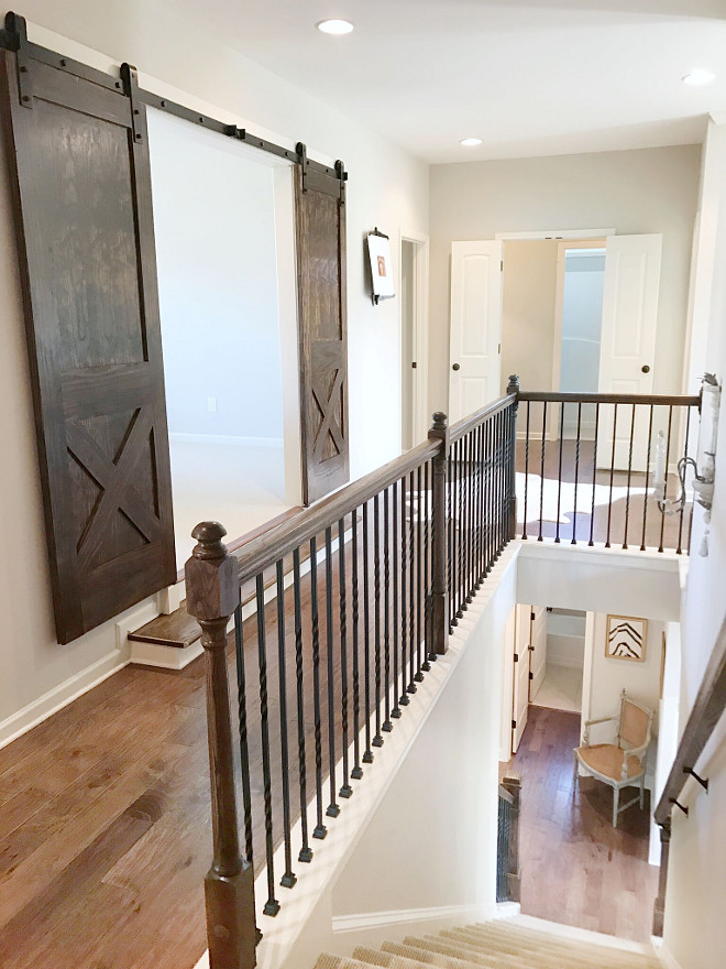 Stained wood barn doors bring plenty of personality to the upstairs hall.