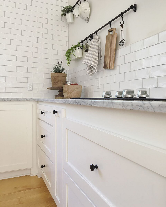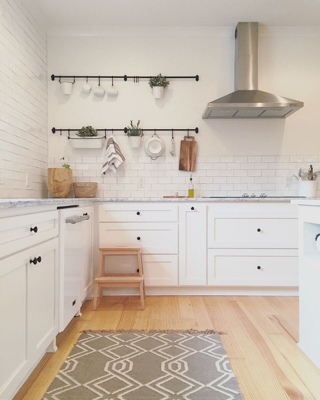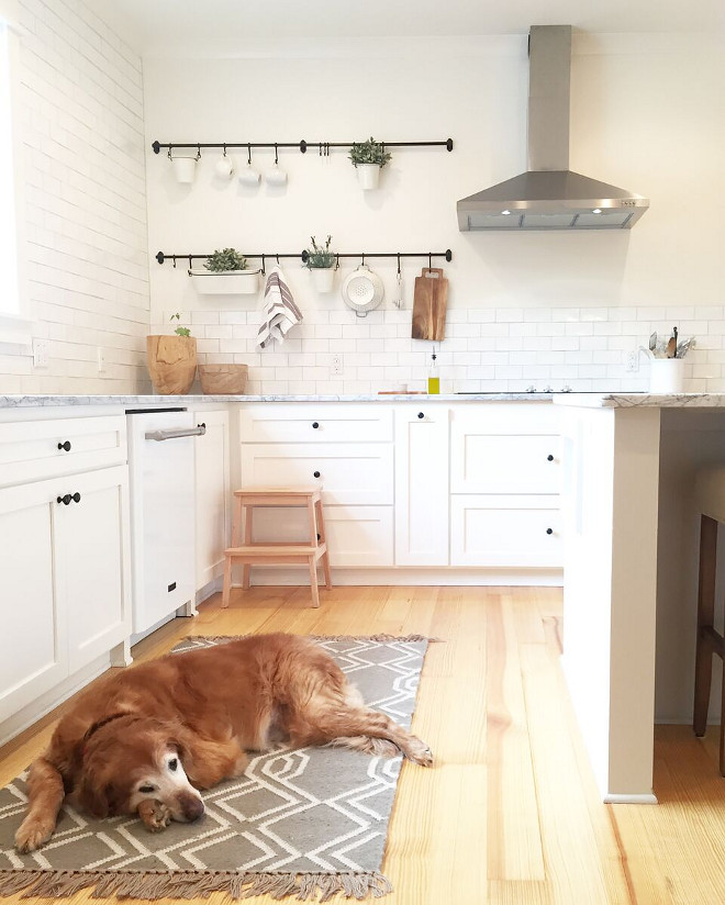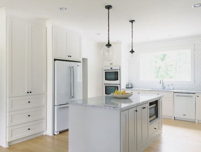 Walls, trim, perimeter cabinets and ceiling paint color: Sherwin Williams Alabaster.