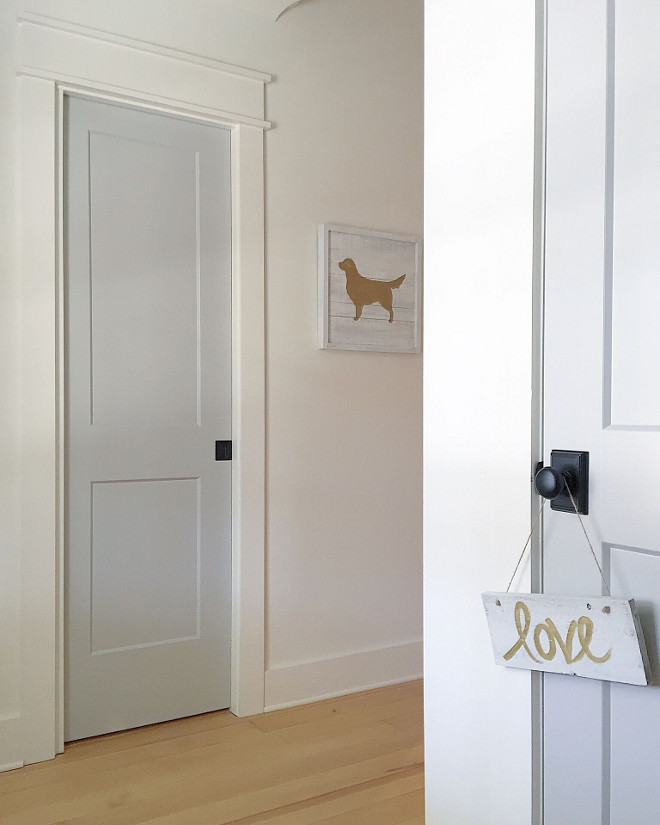 Door: Pocket Door – Masonite Doors Logan Solid Core painted in Sherwin Williams Mindful Gray at 50% strength.