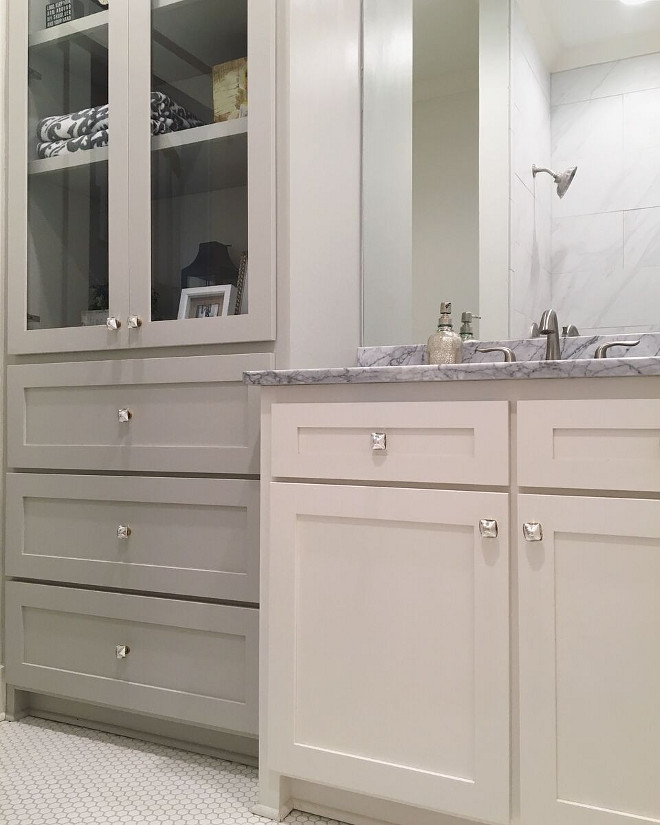 Light gray walls, white trim, clean lines in the shaker style cabinets and the classic white hex floor tile makes this space light, bright and classic with a modern and romantic twist, thanks to the freestanding bathtub and sparkly chandelier.
