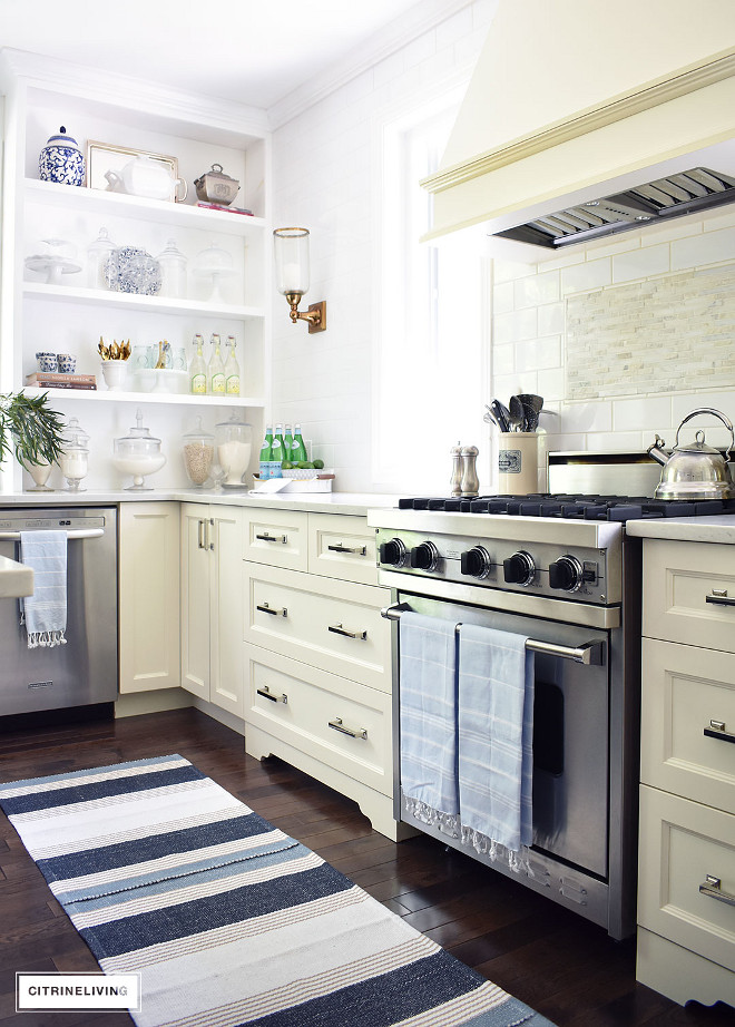 The homeowner added a blue and white striped runner and some turkish towels to bring a coastal vibe to her ivory kitchen.