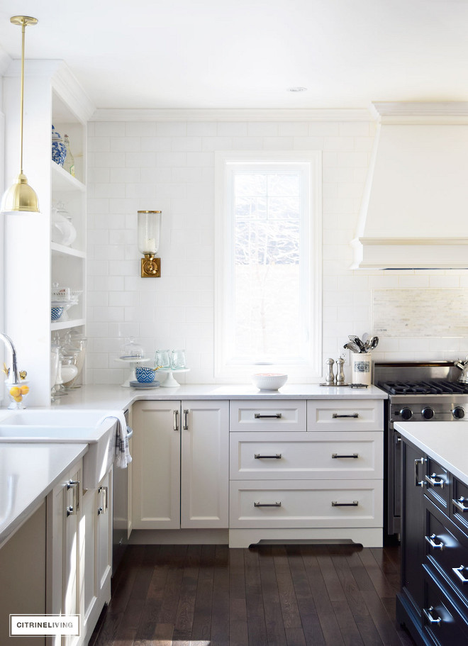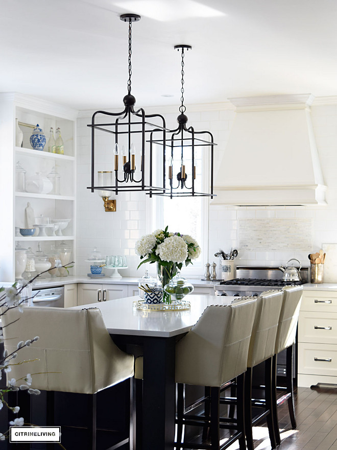 The kitchen was designed around an ‘old-world-traditional-meets-modern’ look. The back wall, as the focal point, has no upper cabinets and it features counter to ceiling white subway tile. The barstools were the driving force behind the kitchen and the jumping off point for the design of this space!