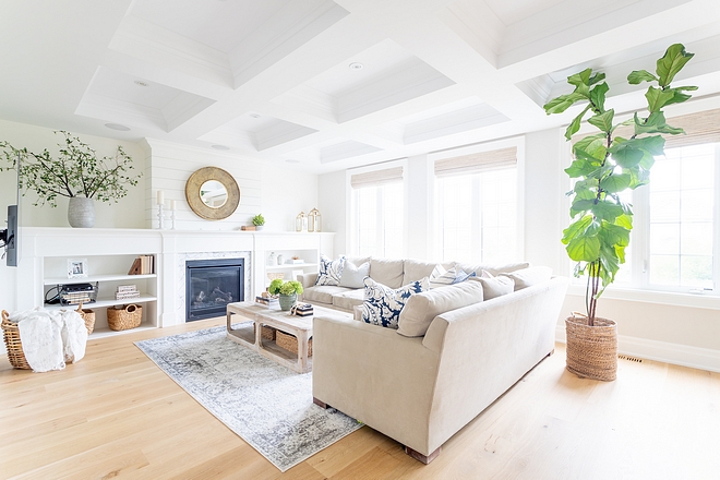 I love the generous size of this room. We opted for a sectional sofa to maximize seating. We added a coffered ceiling to add some character and interest to this room, as well as to add some definition to the space. My husband built the shiplap wall above the fireplace.