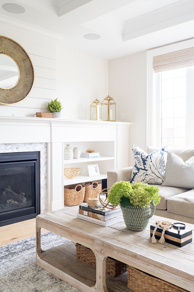 Trim, fireplace and built-ins are Benjamin Moore Simply White.