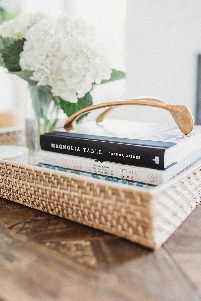 The silver tray and accessories are from Pottery Barn.