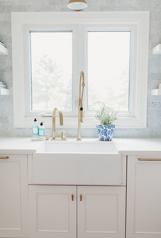 The large farmhouse sink is Siligranite in white by Blanco, and faucets are by Canadian manufacturer Rubinet. They took a long time to get here but I think they were worth the wait.