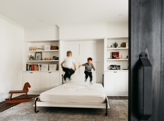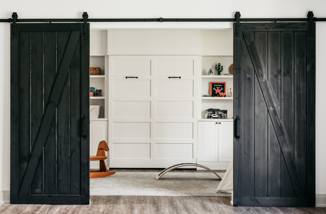 “The Murphy bed is in the middle of the room with plenty of open and closed storage for my children’s toys. The room has barn doors to close off for overnight guests or when the mess of the boy’s toys becomes too much!” – Elyse of Elyse McCurdy Home Designs.