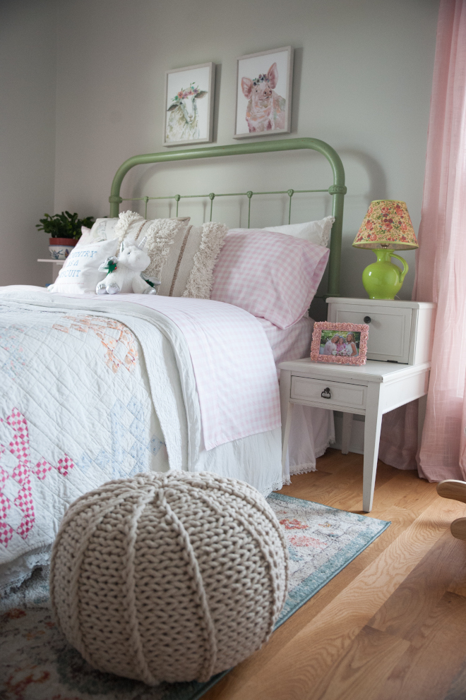 “I wanted my daughterās room to be filled with florals. One wall is papered with Magnolia Home Watercolor Roses. Her bed is antique, along with the soft quilt that adorns it.”