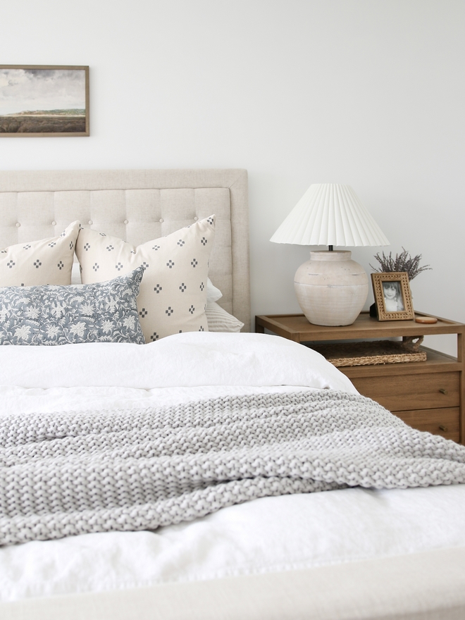 Pillows: White and tan Dot Hmong Pillow, Blush Floral Handblock Linen Pillow & Grey Floral Pillow.