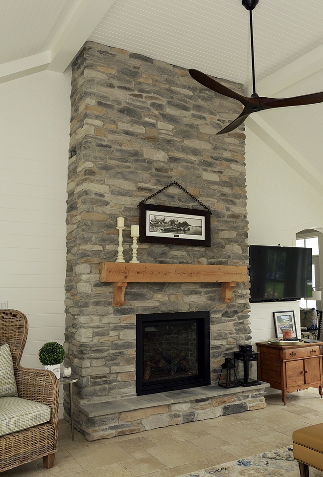 The high vaulted ceilings allowed for a full height traditional heritage stone fireplace. The mantle was salvaged and restored from the original cottage on the property. The white shiplap walls lend nicely to the cottage feel.