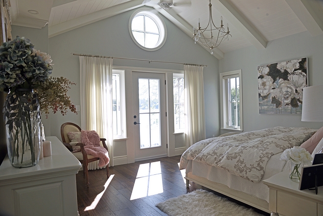 This guest bedroom features an inspiring color scheme of soft greys, blue and white.