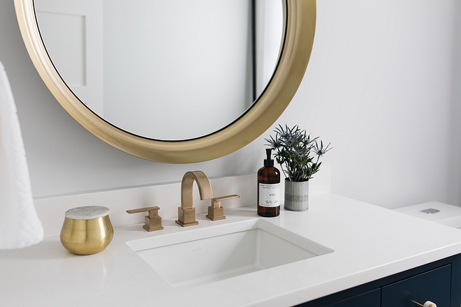 Powder Room Navy Bathroom Cabinet Paint Color: “Naval by Sherwin Williams”.