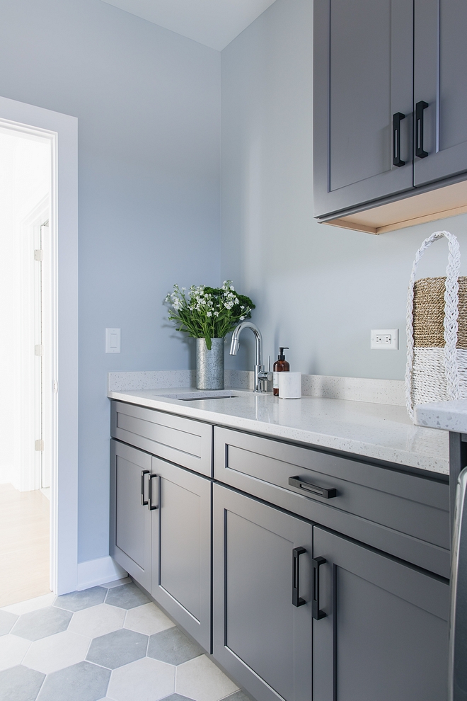 What a beautiful laundry room! The cabinet paint color is “Grizzle Gray SW 7068 by Sherwin Williams”.