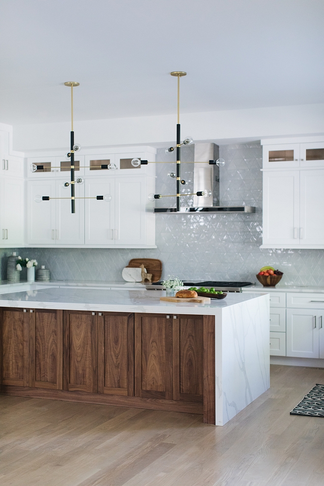 The kitchen island waterfall countertop is “Calacatta Luccia Quartz”.