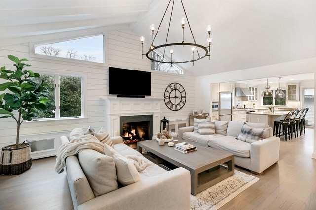 This is easily my favorite room in the house. When we purchased the house, the walls of this room were a green color and popcorn/stucco material. We removed the popcorn from the walls, painted the room Benjamin Moore White Dove, added shiplap to the feature wall, completely reworked the fireplace to match the shiplap wall (the fireplace was originally was a green, solid concrete block which we had our incredible woodworker build around), and added the beautiful Restoration Hardware chandelier (my very favorite décor purchase ever!).