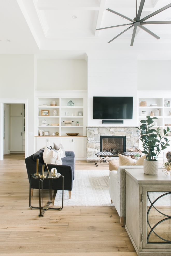 Living Room Cabinets with Shiplap Backing Paint Color – “Benjamin Moore Chantilly Lace OC-65”.