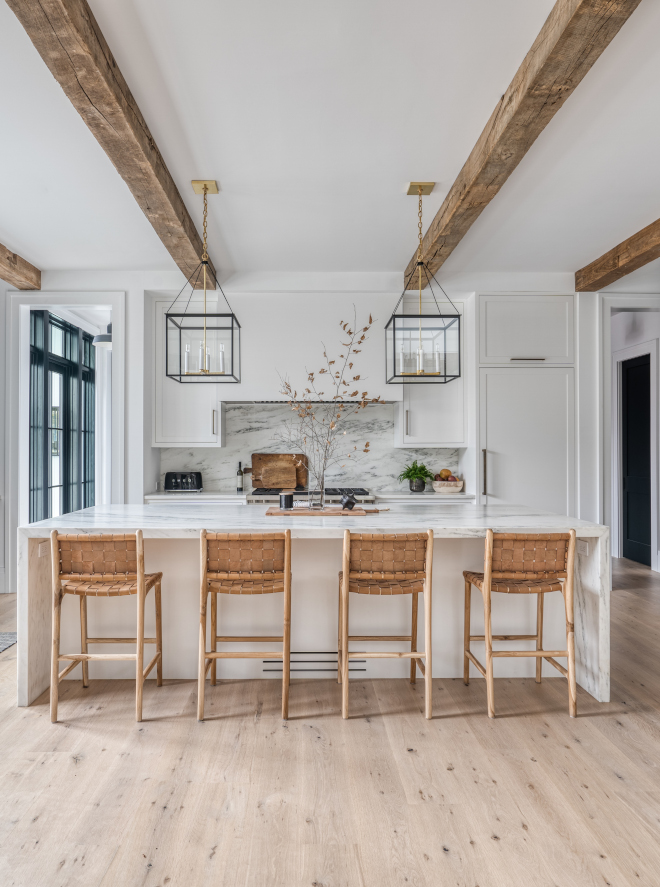 Solid White Oak Beams with Custom Natural Stain, brass hardware and natural marble countertops and backsplash create the ultimate background for this Black and White Modern Farmhouse Kitchen designed by one of my favorite cabinet designers, Stonington Cabinetry & Designs.