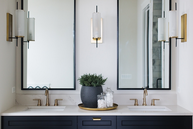 I knew I wanted to have dramatic mirrors that brought your eyes up to a beautiful chandelier. I could not find simple, mid-century style mirrors that were really tall. I decided to use my greatest asset – my trim carpenter. He actually used a sheet of MDF, and some 1x4s cut in half to create the mirror frames. Then we had our painter spray them black when he was spraying the interior doors. After we installed the frames on the wall, the mirror company measured and installed a custom mirror. This project allowed us to create framed mirrors that were the absolute perfect size for the space. I will certainly use this technique again for sure!