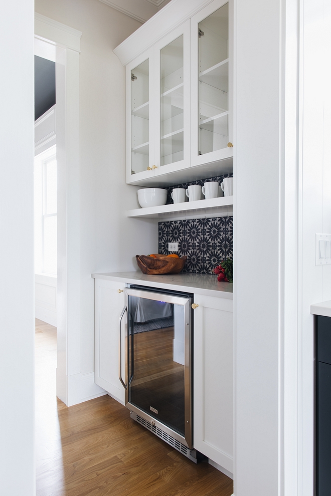 We used a cement tile on the back of the kitchen peninsula. We then used a Caesarstone waterfall to cap the open edge. We love the detail this provides and as a mom, I love the idea of wiping down the dirt that always seems to be where little feet kick. It was a really simple tile project because there isn’t a window or outlet to have to cut around. It’s a flat, plain wall. If you get sick of the tile pattern, it would be so simple just to tile right over the area with another tile.