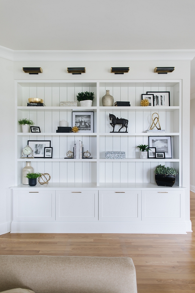 The vertical shiplap along side the elegant fixtures and brass hardware is unexpected but somehow works so beautifully together.