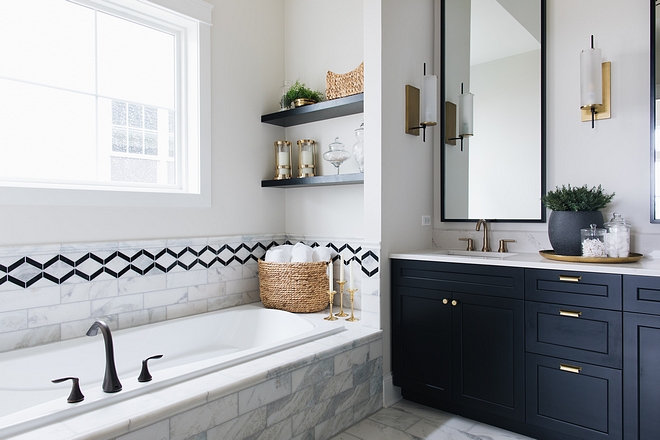The master bathroom was inspired by the ceiling height. Wall paint color is Benjamin Moore OC-23 Classic Grey and the black cabinets are painted in Benjamin Moore Black. Notice the practical and smart room layout.