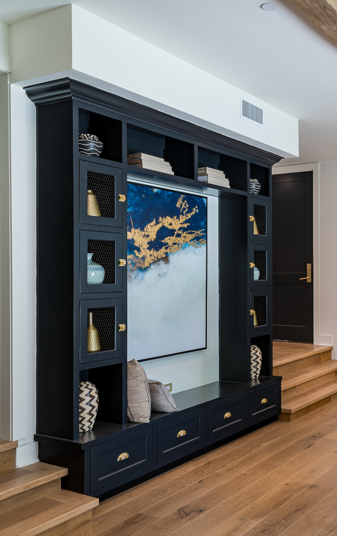 “Ahhh, the wine room. Who doesn’t want a wine room? But who has the space? I came up with a useful and stunning use of the typically wasted under stair hollow. I personally designed a beautifully amber-lit solid walnut alcove beneath the staircase to shelter and display wine and spirits. It’s a showstopper with its handmade leather handle – as it’s the first thing you see when you enter the house.” – Alycia Lane Joseph.