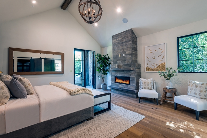 “The wide mantle with its reclaimed wood beams above and below the modern linear fireplace are enveloped by old world stone; bringing the past and the present together as one.”- Alycia Lane Joseph.