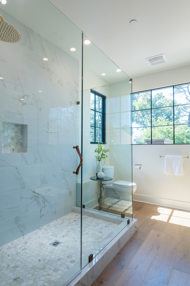 “Master Bathroom boasts a light and brilliant feel. The warm oak flooring and a giant calacatta marble shower kindles a sense of cleanliness and order.”- Alycia Lane Joseph.