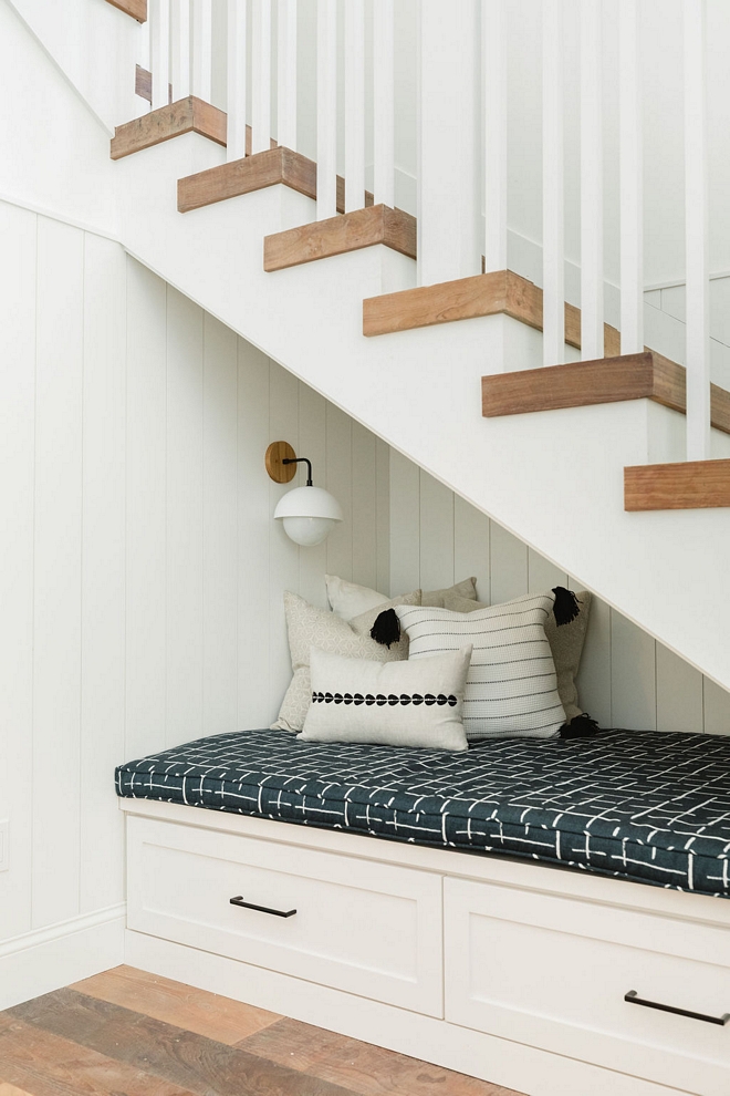 Located under the stairs, this cozy reading nook features vertical shiplap in Benjamin Moore Simply White OC-117 – Satin.
