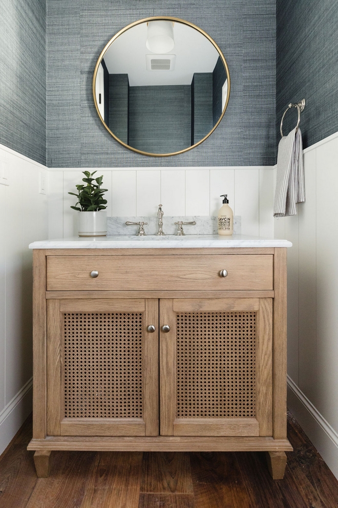 The Powder Room features 48″ Vertical Paneled Wainscot in Chantilly Lace by Benjamin Moore.