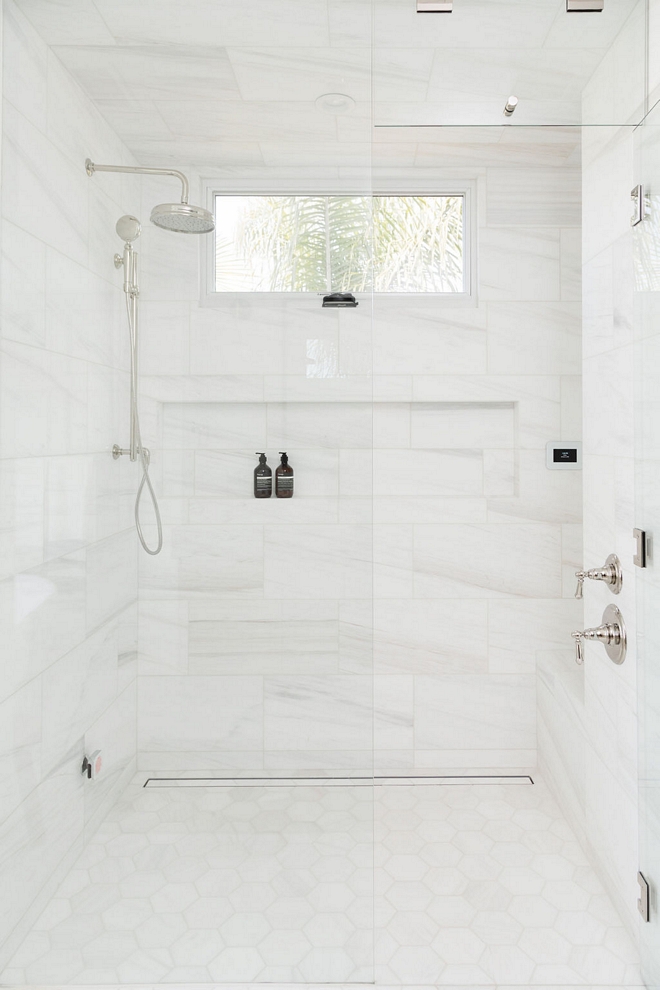 A wide shower niche mimics the window above.
