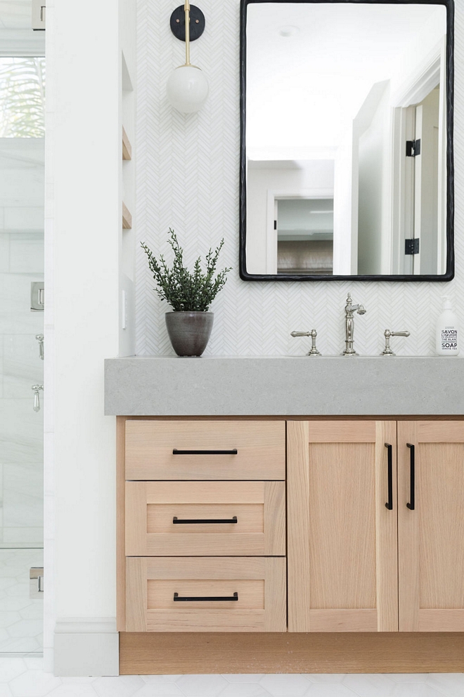 The Master Bathroom features two separated vanities in White Oak and plenty of luxurious elements. Keep reading to know all sources!