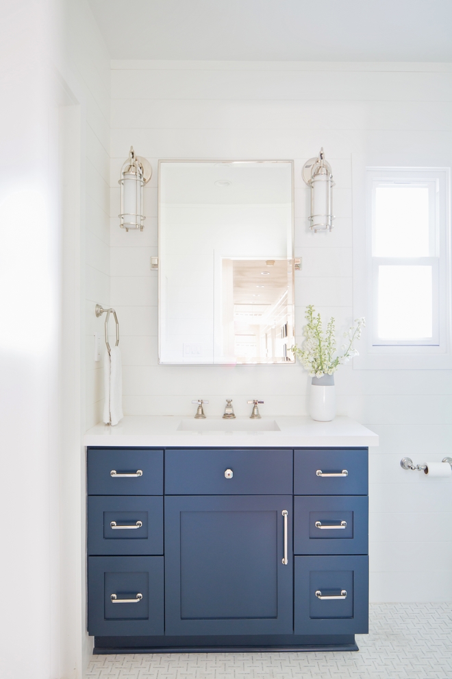 The Powder Room features a custom navy blue vanity with white white quartz countertop and shiplap walls in Sherwin Williams Pure White.