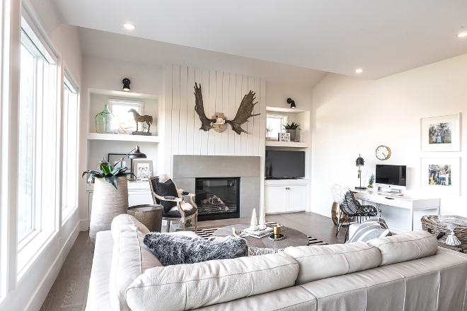 This modern farmhouse family room is perfect for family life. I especially like the custom built-ins with windows.