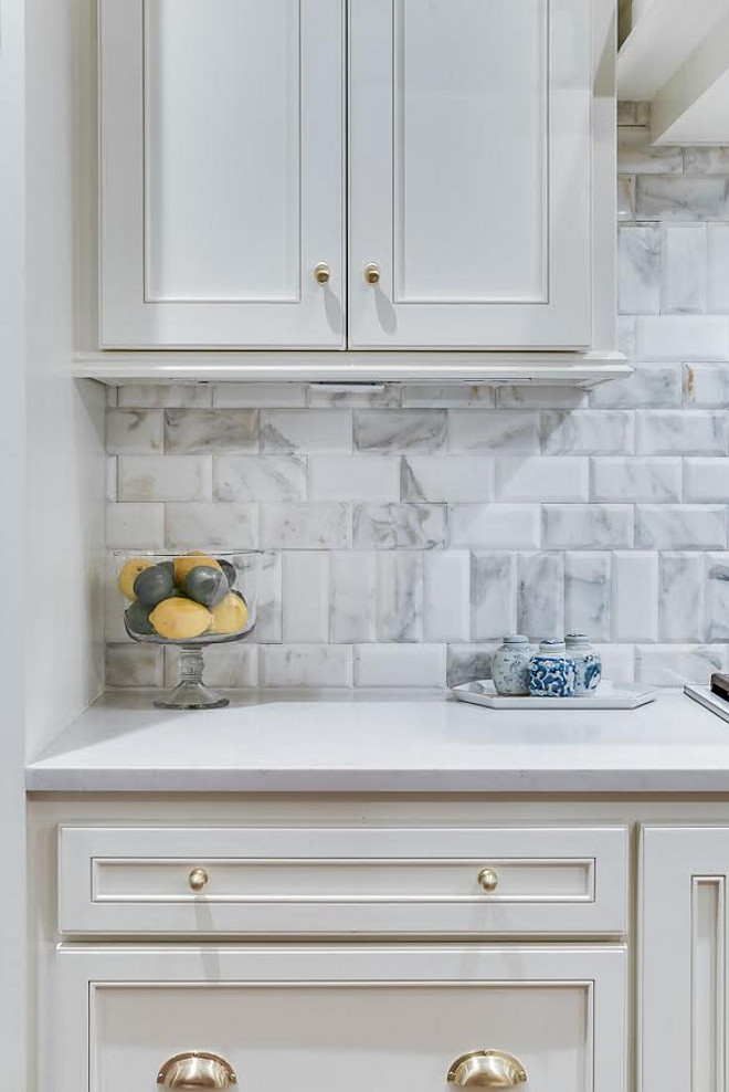 The backsplash is Calacatta gold beveled edge subway tile. Notice how the tile is set.