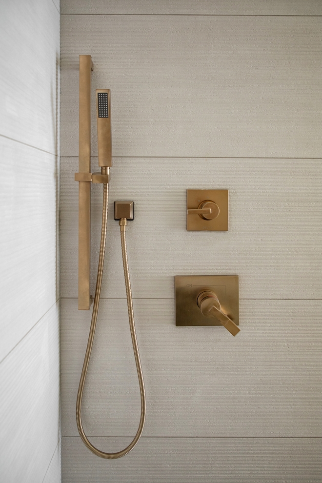 Shower Tile: 2×8 White Tile in Herringbone pattern.
