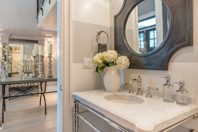 A chic powder room is located just off the foyer. The stripe wall paint color is Sherwin Williams SW 7071 Gray Screen and Sherwin Williams SW 7006 Extra White – with 20” horizontal stripes.