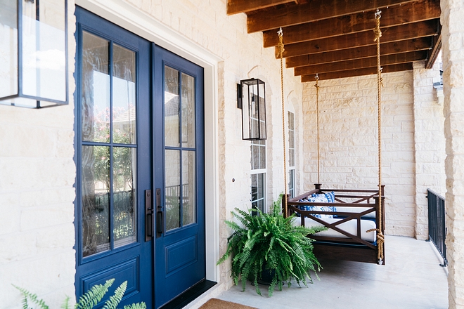 “We installed a porch swing with navy blue and white accents. The seat is upholstered in a navy fabric with contrast pale blue piping. A mix of patterned pillows add some personality to the front porch. The dark stain wood frame and decorative siding of the bench gives a strong contrast to the front porch swing.” – Heather Scott.